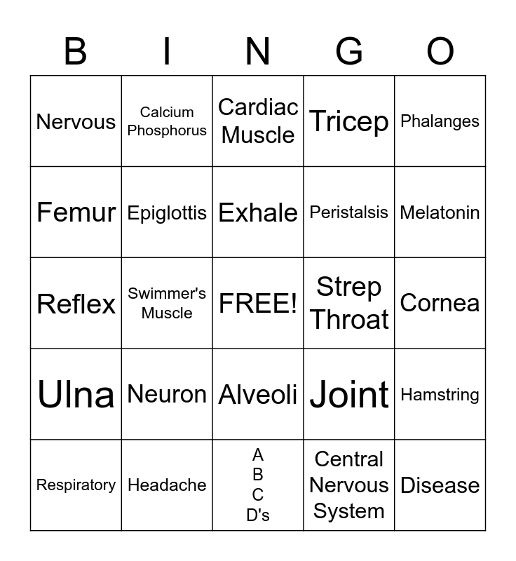 This bingo card has a free space and 24 words: Neuron, Headache, Exhale, Respiratory, Phalanges, Nervous, Femur, Calcium Phosphorus, Strep Throat, Alveoli, Peristalsis, Reflex, Joint, Hamstring, Epiglottis, Central Nervous System, Cornea, Cardiac Muscle, Melatonin, Swimmer's Muscle, Disease, Ulna, Tricep and A B C D's.