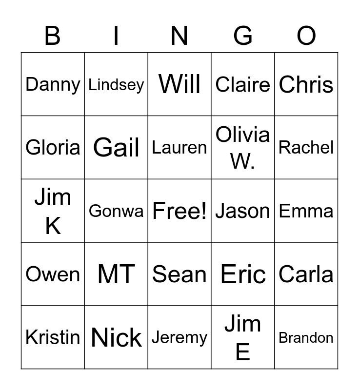 This bingo card has a free space and 29 words: Kristin, Olivia H., Gonwa, Jack, Danny, Will, Gail, MT, Jason, Nick, Emma, Brandon, Jeremy, Jim E, Rachel, Darren, Sean, Owen, Chris, Jim K, Eric, Austin, Olivia W., Gloria, Claire, Lindsey, Carla, Lauren and Zach.