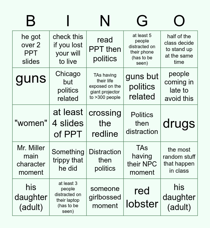 This bingo card has a free space and 44 words: his daughter (teenager), his daughter (adult), his son (adult), his daughter (adult), his daughter but vegan, red lobster, read PPT then politics, read PPT then distraction, half of the class decide to stand up at the same time, at least 3 people distracted on their laptop (has to be seen), at least 5 people distracted on their phone (has to be seen), Politics then distraction, Distraction then politics, Something trippy that he did, weird obscure topics that he said, someone girlbossed moment, "minority", "women", "people of color", people coming in late to avoid this, check this if you lost your will to live, check this if you wonder the meaning of your existence, he got over 1 PPT slides, he got over 2 PPT slides, somekind of substances, drugs, travelling, TAs trying their absolute best, TAs having their NPC moment, Mr. Miller main character moment, ???? What is happening here???, the most random stuff that happen in class, yelling randomly after answering a student question, at least 3 slides of PPT, at least 4 slides of PPT, *shushhhhhhhh*, yelling randomly after a student question about politics, TAs don't really know what's going on, TAs having their life exposed on the giant projector to >300 people, guns, guns but politics related, Chicago but guns, Chicago but politics related and he repeated something politically related that he already said before..