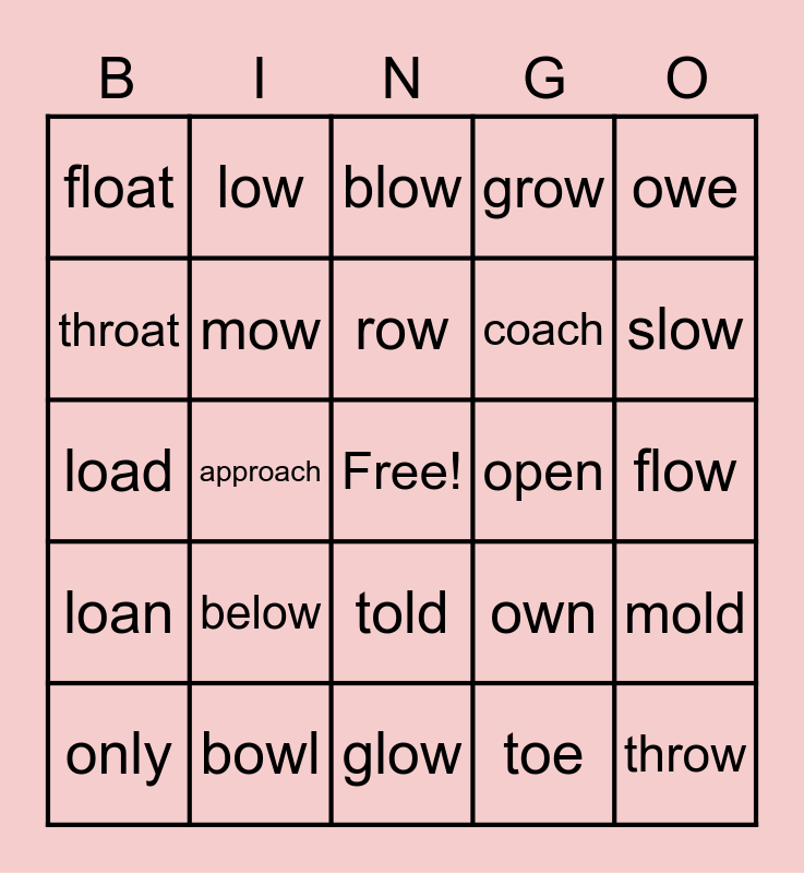 This bingo card has a free space and 24 words: below, bowl, row, only, owe, float, throat, low, open, told, coach, load, own, mold, mow, toe, flow, blow, slow, approach, throw, loan, grow and glow.