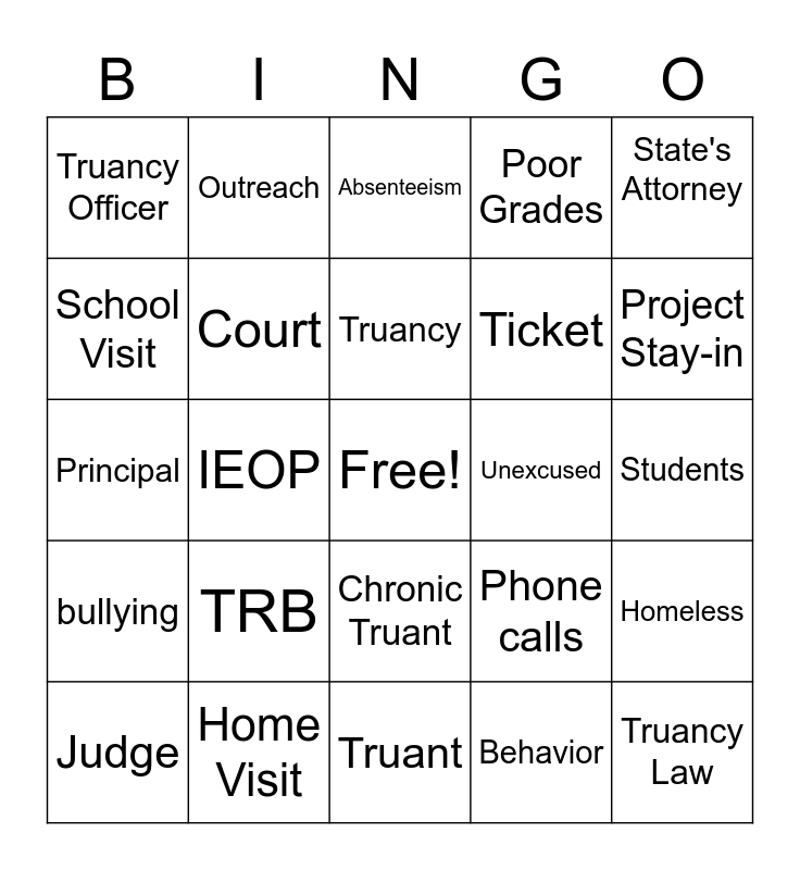 This bingo card has a free space and 24 words: TRB, Home Visit, Truancy, Judge, State's Attorney, Truancy Officer, School Visit, Outreach, Unexcused, Chronic Truant, Ticket, Principal, Phone calls, Homeless, Court, Behavior, Students, Absenteeism, Project Stay-in, IEOP, Truancy Law, bullying, Poor Grades and Truant.