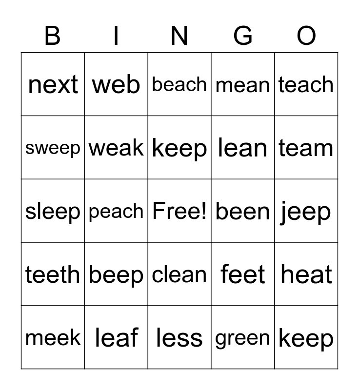 This bingo card has a free space and 24 words: beep, leaf, keep, meek, teach, next, sweep, web, been, clean, lean, sleep, feet, heat, weak, green, jeep, beach, team, peach, keep, teeth, mean and less.
