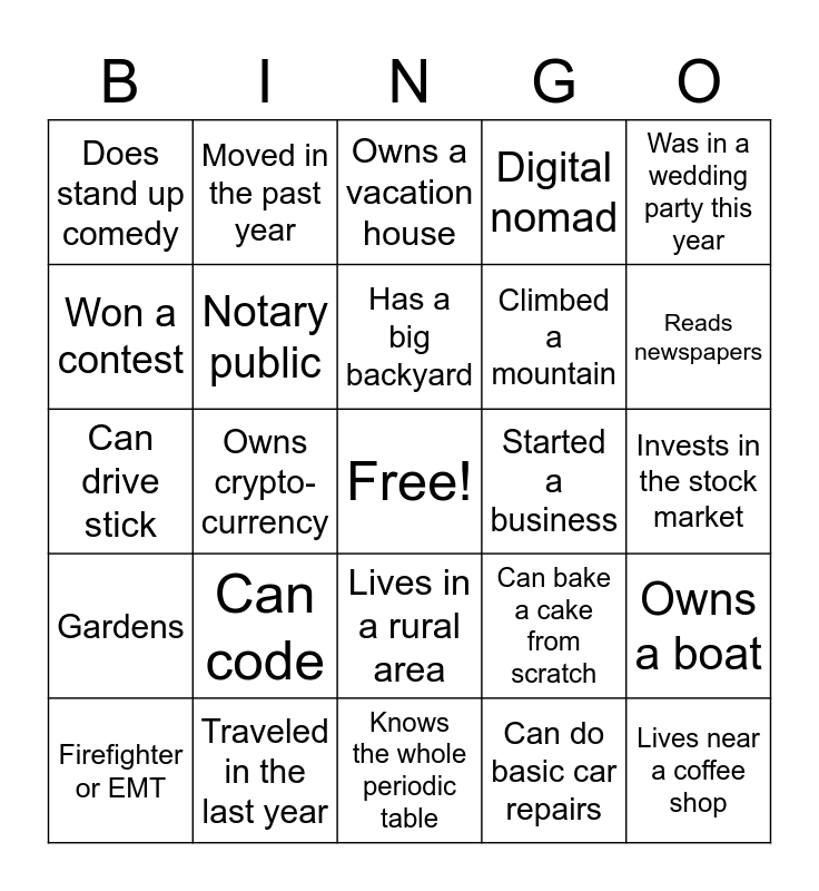 This bingo card has a free space and 24 words: Can code, Traveled in the last year, Has a big backyard, Firefighter or EMT, Was in a wedding party this year, Does stand up comedy, Won a contest, Moved in the past year, Started a business, Lives in a rural area, Climbed a mountain, Can drive stick, Can bake a cake from scratch, Owns a boat, Notary public, Can do basic car repairs, Invests in the stock market, Owns a vacation house, Reads newspapers, Owns crypto-currency, Lives near a coffee shop, Gardens, Digital nomad and Knows the whole periodic table.