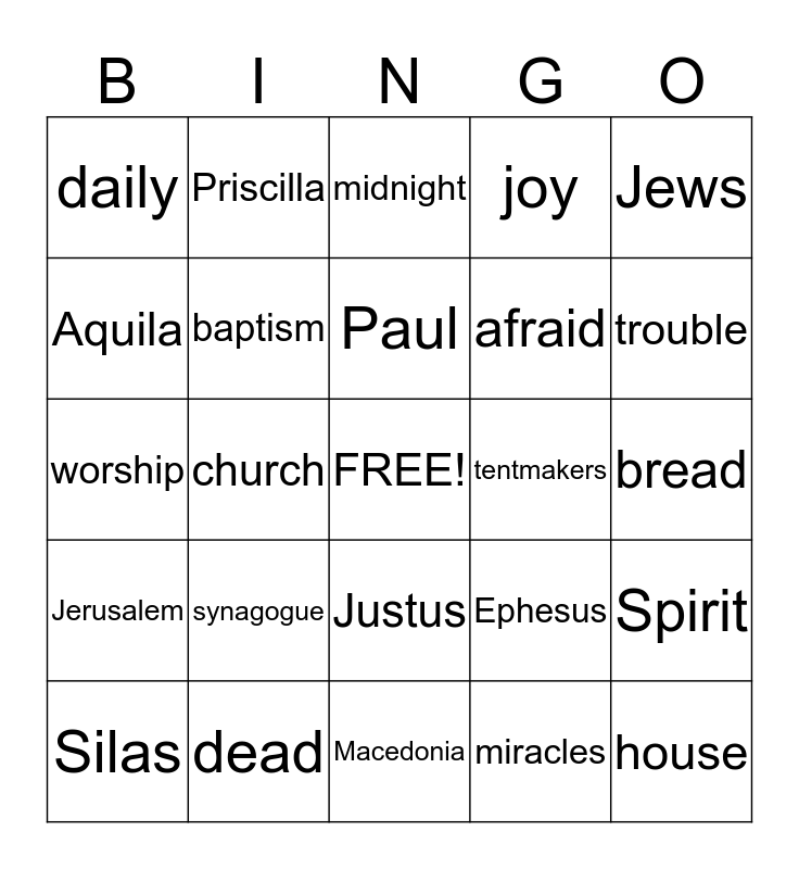 This bingo card has a free space and 24 words: synagogue, dead, Paul, Silas, Jews, daily, Aquila, Priscilla, tentmakers, Justus, afraid, worship, Ephesus, Spirit, baptism, miracles, bread, midnight, trouble, church, house, Jerusalem, joy and Macedonia.