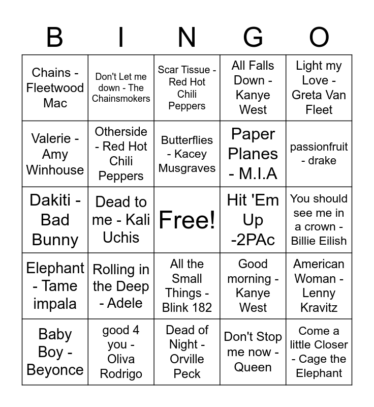 This bingo card has a free space and 30 words: good 4 you - Oliva Rodrigo, Streets - Doja Cat, Dead to me - Kali Uchis, The less I know the better - Tame Impala, Chains - Fleetwood Mac, Scar Tissue - Red Hot Chili Peppers, Otherside - Red Hot Chili Peppers, All the Small Things - Blink 182, Hit 'Em Up -2PAc, Dead of Night - Orville Peck, You should see me in a crown - Billie Eilish, Come a little Closer - Cage the Elephant, Don't Stop me now - Queen, Go flex - post malone, passionfruit - drake, on a plain - nirvana, Good morning - Kanye West, Elephant - Tame impala, Rolling in the Deep - Adele, Light my Love - Greta Van Fleet, Dakiti - Bad Bunny, Empire State of Mind - Jay Z, Don't Let me down - The Chainsmokers, Paper Planes - M.I.A, Valerie - Amy Winhouse, All Falls Down - Kanye West, American Woman - Lenny Kravitz, Baby Boy - Beyonce, Butterflies - Kacey Musgraves and By the way - Red Hot Chili Peppers.