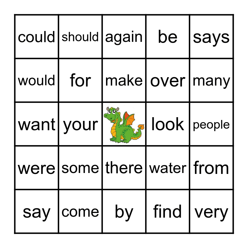 This bingo card has a free space and 24 words: some, come, make, say, says, could, would, should, look, there, over, want, water, from, for, find, people, again, many, your, very, were, be and by.