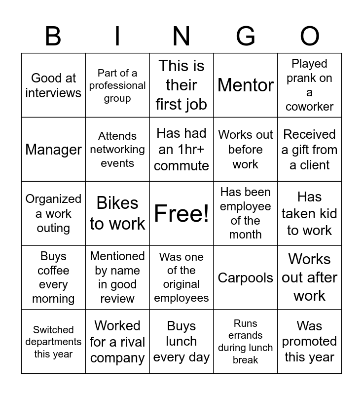 This bingo card has a free space and 24 words: Mentioned by name in good review, Worked for a rival company, Has had an 1hr+ commute, Switched departments this year, Played prank on a coworker, Good at interviews, Manager, Part of a professional group, Has been employee of the month, Was one of the original employees, Works out before work, Organized a work outing, Carpools, Works out after work, Attends networking events, Runs errands during lunch break, Has taken kid to work, This is their first job, Received a gift from a client, Bikes to work, Was promoted this year, Buys coffee every morning, Mentor and Buys lunch every day.