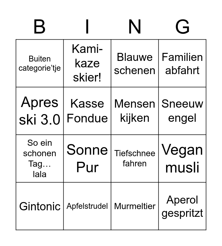 This bingo card has 16 words: Gintonic, Apfelstrudel, Blauwe schenen, Familien abfahrt, Apres ski 3.0, Kami-kaze skier!, Tiefschnee fahren, Vegan musli, Buiten categorie’tje, Kasse Fondue, Murmeltier, Sneeuw engel, So ein schonen Tag…lala, Sonne Pur, Mensen kijken and Aperol gespritzt.