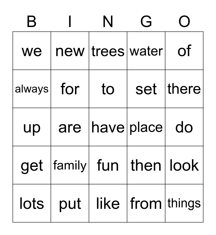 This bingo card has 25 words: family, like, to, lots, of, we, always, new, place, fun, set, up, then, look, for, things, do, trees, there, are, have, put, get, water and from.