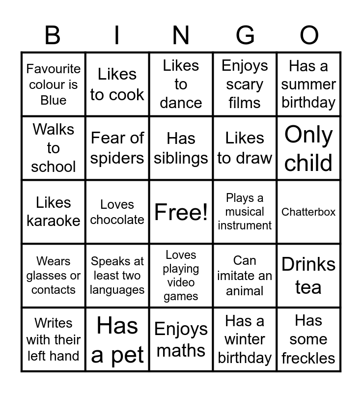 This bingo card has a free space and 24 words: Speaks at least two languages, Has a pet, Has siblings, Writes with their left hand, Has a summer birthday, Favourite colour is Blue, Walks to school, Likes to cook, Plays a musical instrument, Loves playing video games, Likes to draw, Likes karaoke, Can imitate an animal, Drinks tea, Fear of spiders, Has a winter birthday, Chatterbox, Likes to dance, Only child, Loves chocolate, Has some freckles, Wears glasses or contacts, Enjoys scary films and Enjoys maths.