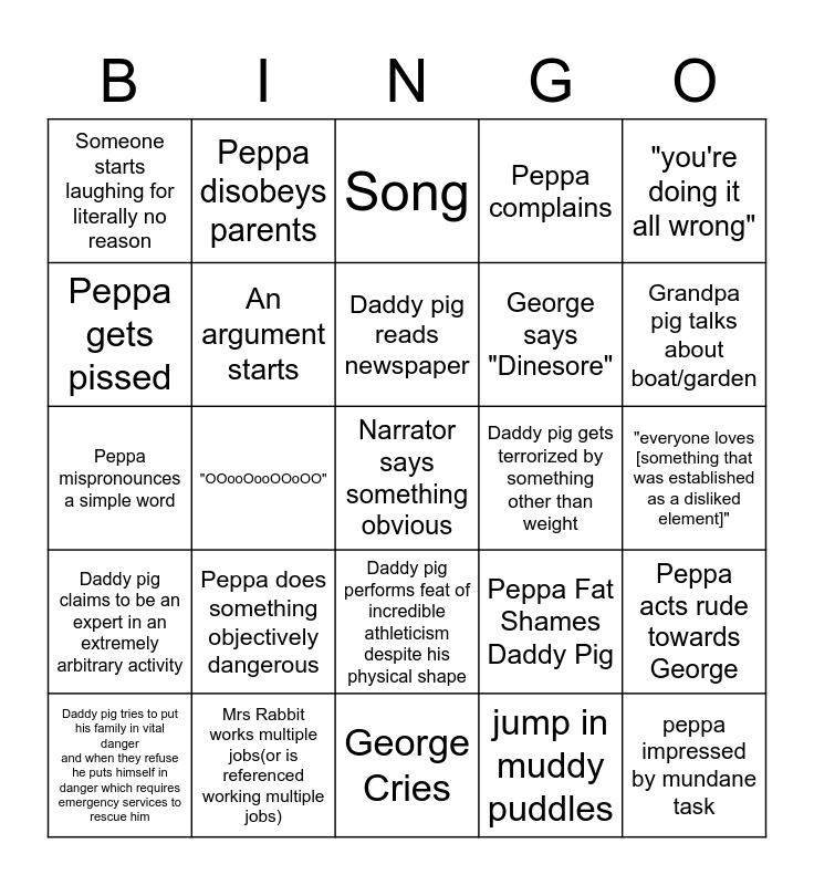 This bingo card has a free space and 27 words: Peppa Fat Shames Daddy Pig, Peppa acts condescending, George says "Dinesore", George Cries, Peppa gets pissed, Song, Peppa disobeys parents, Daddy pig claims to be an expert in an extremely arbitrary activity, Daddy pig gets terrorized by something other than weight, Peppa acts rude towards George, Peppa mispronounces a simple word, Peppa complains, Daddy pig tries to put his family in vital danger and when they refuse he puts himself in danger which requires emergency services to rescue him, Mrs Rabbit works multiple jobs(or is referenced working multiple jobs), Grandpa pig talks about boat/garden, Peppa cosplays, An argument starts, Daddy pig reads newspaper, Peppa does something objectively dangerous, Someone starts laughing for literally no reason, "everyone loves [something that was established as a disliked element]", jump in muddy puddles, "OOooOooOOoOO", peppa impressed by mundane task, Daddy pig performs feat of incredible athleticism despite his physical shape, "you're doing it all wrong" and somebody gets scared.