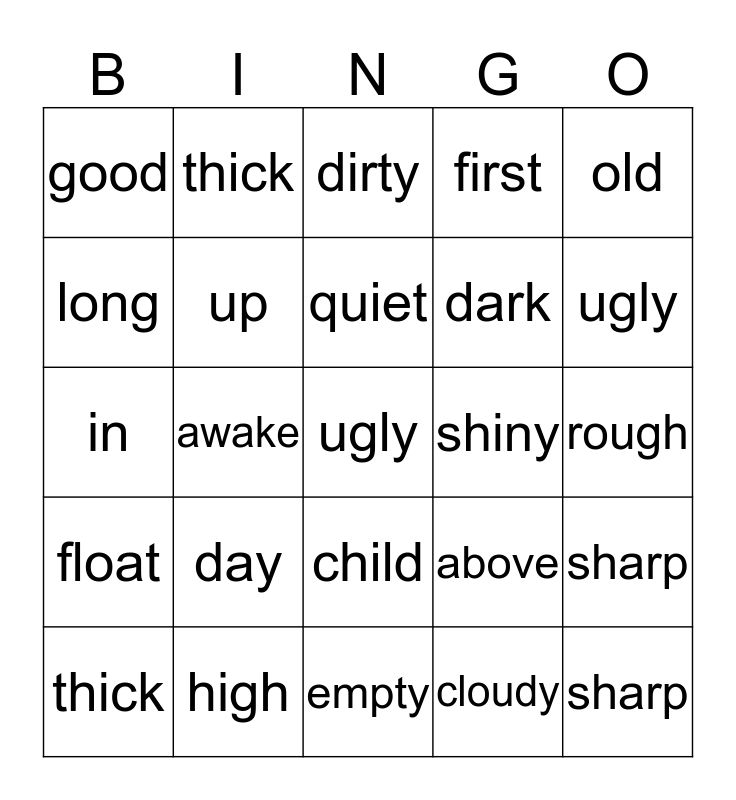 This bingo card has a free space and 24 words: day, high, quiet, thick, old, good, long, thick, shiny, child, dark, in, above, sharp, up, cloudy, rough, dirty, ugly, awake, sharp, float, first and empty.