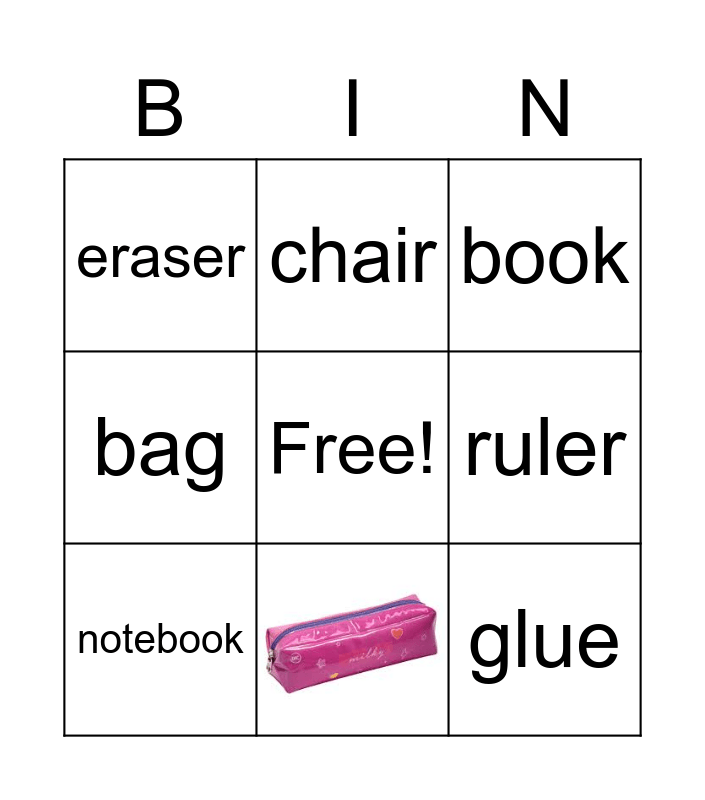 This bingo card has 1 images, a free space and 11 words: table, scissors, glue, ruler, chair, book, uniform, eraser, bag, notebook and sharpener.