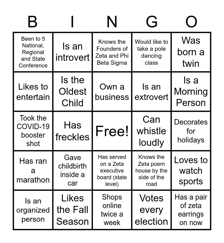 This bingo card has a free space and 31 words: Shops online twice a week, Likes to do gardening, Has freckles, Is a Zeta Dove, Been to 5 National, Regional and State Conference, Knows the Founders of Zeta and Phi Beta Sigma, Is the Oldest Child, Knows the Zeta poem house by the side of the road, Can whistle loudly, Votes every election, Decorates for holidays, Has a pair of zeta earrings on now, Has a pair of white shoes on now, Has a zeta scarf on now, Is a Morning Person, Is a Afternoon Person, Loves to watch sports, Gave childbirth inside a car, Has ran a marathon, Has served on a Zeta executive board (state level), Was born a twin, Likes to do scrapbooking, Is an organized person, Is an introvert, Is an extrovert, Likes to entertain, Would like to take a pole dancing class, Took the COVID-19 booster shot, Likes the Fall Season, Own a business and Likes the new TV show "Abbott Elementary".