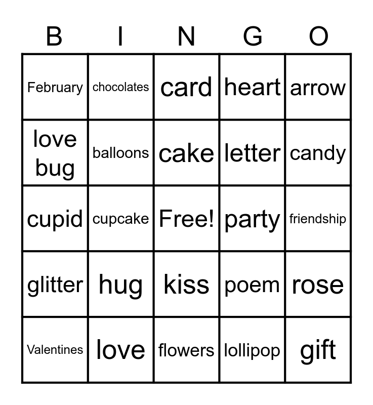 This bingo card has a free space and 24 words: hug, love, cake, Valentines, arrow, February, love bug, chocolates, party, kiss, letter, cupid, poem, rose, balloons, lollipop, friendship, card, candy, cupcake, gift, glitter, heart and flowers.