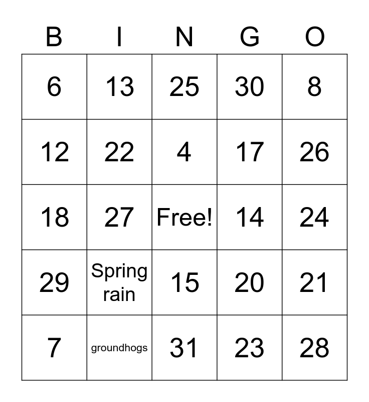This bingo card has a free space and 24 words: Spring rain, groundhogs, 4, 7, 8, 6, 12, 13, 14, 15, 17, 18, 20, 21, 22, 23, 24, 25, 26, 27, 28, 29, 30 and 31.