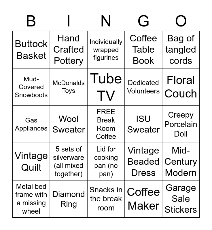 This bingo card has a free space and 94 words: A million precious moments figurines, Puzzles with one missing piece, Snacks in the break room, Cleaned a toy before testing it, Vintage Feed Sacks, NIKE shoes with a missing insole, Queen Canopy Bed, Metal bed frame with a missing wheel, Collection of collectible plates, Eddie Bauer Jacket, A 1000 piece china set, New Volunteer Application, 10 bins of Christmas in February, Dedicated Volunteers, Everything but the dorm room, Bag of tangled cords, Individually wrapped figurines, Bags and bags of fake flowers, Coffee Mugs with spoon marks, Bag of mixed earrings, A mateless shoe, One pillowcase, Spider in the ceiling, Hand Warmers for sorters, 5 sets of silverware (all mixed together), McDonalds Toys, Bag of Cards with no envelopes, tangled yarn skeins, very dirty but nice brand shoes, 300 lbs Hutch, Diamond Ring, Lid for cooking pan (no pan), One-of-a-kind item, 80s Wedding Dress, Hand Crafted Pottery, 20 bins of kids clothes, Dated Ceiling Fan, Mid-Century Modern, Tube TV, Vintage Beaded Dress, Gas Appliances, Vintage Quilt, Creepy Porcelain Doll, Mason Jars, Garage Sale Stickers, Glass Recycling, Paper Recycling, Trip to the Warehouse, Starbucks Coffee Mug, Pioneer Women Pan, Pampered Chef, Coffee Maker, Massive Microwave, Wine Glasses, LEVI Jeans, Packing Materials, Recycled Aldi's Bags, American Girls Doll, Build-A-Bear, Dated Textbooks, Wool Sweater, A whole bin of fabric, Knife Block, Picture Albums, Blu-Ray, Baby Onesies, Tall Blinds, Christmas tree in March, Mud-Covered Snowboots, Knock-off Coach Purse, Reusable Bags, Drawstring Bags, Recycled Ziplocs, Expired Beauty Products, Coffee Table Book, Particle Board Entertainment Center, Furniture on Wheels, Floral Couch, Mid-Century Modern, Guitar, Industrial Style, 80s Style Decor, Bell Bottom Jeans, ISU Sweater, Buttock Basket, Coats in July, Mardi Gras Beads, Plastic Headbands, Kids Silverware, Half-Used Candle, Woodwick Candle, Creepy Costume, Votive and Full-Sized Sheets.