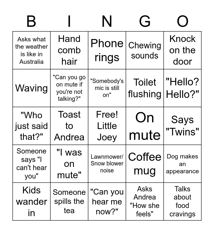 This bingo card has a free space and 28 words: Dog makes an appearance, Someone walks by, Toilet flushing, Asks Andrea "How she feels", Waving, Phone rings, Hand comb hair, Someone says "I can't hear you", On mute, Kids wander in, "Who just said that?", Chewing sounds, Someone spills the tea, "Can you hear me now?", "Hello? Hello?", "Sorry, I'm late", "I was on mute", "Can you go on mute if you're not talking?", "Somebody's mic is still on", Lawnmower/ Snow blower noise, Asks what the weather is like in Australia, Asks to see baby bump, Talks about food cravings, Toast to Andrea, Says "Twins", Coffee mug, Knock on the door and Looks for mute/video button.