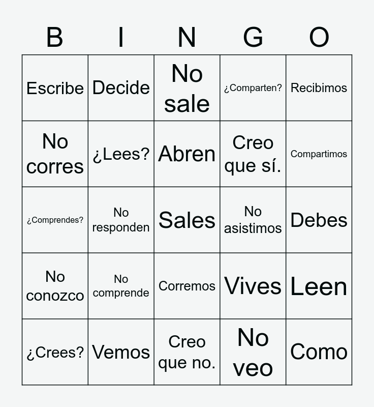 This bingo card has a free space and 39 words: Beben, Subimos, Rompen, ¿Lees?, ¿Crees?, Corremos, Abren, Cubre, Recibimos, No conozco, No responden, ¿Comparten?, Como, Debes, No asistimos, No comprende, Aprenden, Escribe, ¿Venden?, Vives, No corres, Creo que no., Creo que sí., Compartimos, No bebe, Subes, Admiten, No debemos, Debo, Decide, Decides, Salgo, No sale, Vemos, No veo, ¿Viven?, Leen, ¿Comprendes? and ¿Asistes?.