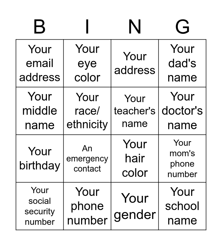 This bingo card has 16 words: Your phone number, Your mom's phone number, Your address, Your email address, Your birthday, Your eye color, Your hair color, Your gender, Your middle name, Your race/ ethnicity, Your social security number, Your dad's name, An emergency contact, Your doctor's name, Your teacher's name and Your school name.