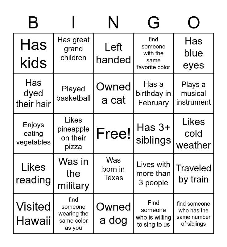 This bingo card has a free space and 25 words: Was in the military, Owned a dog, Owned a cat, Visited Hawaii, Has blue eyes, Has kids, Has dyed their hair, Has great grand children, Has 3+ siblings, Was born in Texas, Has a birthday in February, Enjoys eating vegetables, Lives with more than 3 people, Traveled by train, Played basketball, Enjoys history, Likes cold weather, Left handed, Plays a musical instrument, Likes pineapple on their pizza, find someone who has the same number of siblings, find someone wearing the same color as you, Likes reading, find someone with the same favorite color and Find someone who is willing to sing to us.