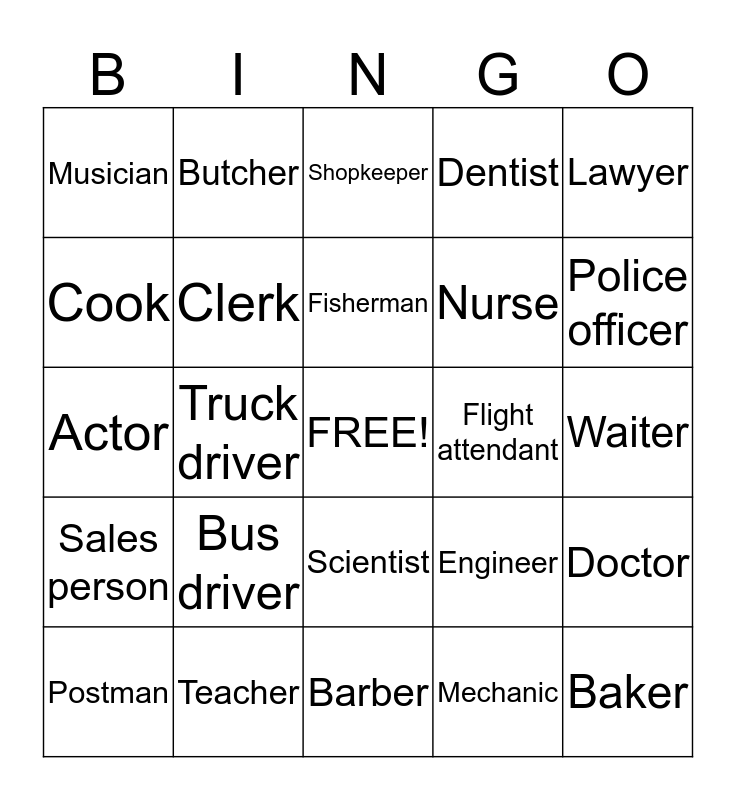 This bingo card has a free space and 48 words: Artist, Baker, Banker, Barber, Bus driver, Businessman, Butcher, Carpenter, Cook, Chef, Clerk, Dentist, Doctor, Engineer, Farmer, Firefighter, Fisherman, Flight attendant, Receptionist, Lawyer, Truck driver, Mechanic, Musician, Nurse, Pilot, Police officer, Postman, Professor, Scientist, Sales person, Sailor, Soldier, Student, Taxi driver, Teacher, Train driver, Clergyman, Waiter, Waitress, Housewife, Office worker, Factory worker, Shopkeeper, Singer, Actor, Actress, Musician and Journalist.