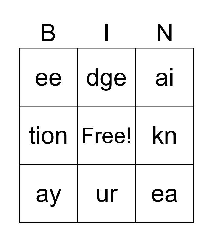 This bingo card has a free space and 8 words: kn, ai, dge, ay, ee, ea, tion and ur.