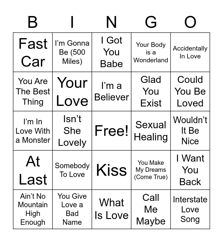 This bingo card has a free space and 63 words: Sucker, What Makes You Beautiful, Hooked on a Feeling, I Want You Back, Wake Me Up Before You Go-Go, You’ve Got a Friend in Me, I’m Gonna Be (500 Miles), Can’t Feel My Face, I’m a Believer, I Like It, I Love It, Kiss, You Can’t Hurry Love, Wouldn’t It Be Nice, Accidentally In Love, My Girl, You Are The Best Thing, Isn’t She Lovely, Fast Car, Let’s Get It On, Glad You Exist, Somebody To Love, At Last, Your Body is a Wonderland, Let’s Stay Together, Landslide, I Will Always Love You, Every Breath You Take, Can’t Take My Eyes Off of You, (Your Love Keeps Lifting Me) Higher, You Make Me Feel Like Dancing, Signed, Sealed, Delivered, I Can’t Help Myself (Sugar Pie, Honey Bunch), Baby Love, Brown Eyed Girl, Could You Be Loved, Ain’t No Mountain High Enough, I Got You (I Feel Good), Call Me Maybe, What’s Love Got To Do With It, Your Love, I’m In Love With a Monster, Sexual Healing, Savage Love, Wild Thing, Interstate Love Song, You Give Love a Bad Name, How Will I Know, You Make My Dreams (Come True), Got My Mind Set on You, You’re the One That I Want, You’ve Got the Love, What Is Love, Love Train, Wonderful Tonight, You Sexy Thing, I Got You Babe, How Sweet It Is, Do You Love Me, Chapel of Love, Lean on Me, Crazy Little Thing Called Love, This Will Be (An Everlasting Love) and Best of My Love.