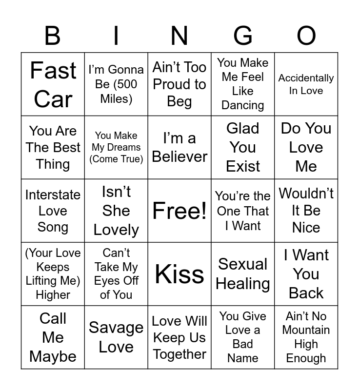 This bingo card has a free space and 65 words: Sucker, What Makes You Beautiful, Hooked on a Feeling, I Want You Back, Wake Me Up Before You Go-Go, You’ve Got a Friend in Me, I’m Gonna Be (500 Miles), Can’t Feel My Face, I’m a Believer, I Like It, I Love It, Kiss, You Can’t Hurry Love, Wouldn’t It Be Nice, Accidentally In Love, My Girl, You Are The Best Thing, Isn’t She Lovely, Fast Car, Let’s Get It On, Glad You Exist, Can’t Take My Eyes Off of You, (Your Love Keeps Lifting Me) Higher, You Make Me Feel Like Dancing, Signed, Sealed, Delivered, I Can’t Help Myself (Sugar Pie, Honey Bunch), Baby Love, Brown Eyed Girl, Could You Be Loved, Ain’t No Mountain High Enough, I Got You (I Feel Good), Call Me Maybe, What’s Love Got To Do With It, Your Love, I’m In Love With a Monster, Sexual Healing, Savage Love, Wild Thing, Interstate Love Song, You Give Love a Bad Name, How Will I Know, You Make My Dreams (Come True), Got My Mind Set on You, You’re the One That I Want, You’ve Got the Love, What Is Love, Love Train, Do You Love Me, Chapel of Love, Lean on Me, Crazy Little Thing Called Love, This Will Be (An Everlasting Love), Best of My Love, For Once in My Life, Love Will Keep Us Together, Crazy Love, Sugar Sugar, Love Shack, Ain’t Too Proud to Beg, Stand By Me, I’ll Stand By You, I Just Called to Say I Love You, Isn’t She Lovely, You Belong With Me, Islands in the Stream and Is This Love.