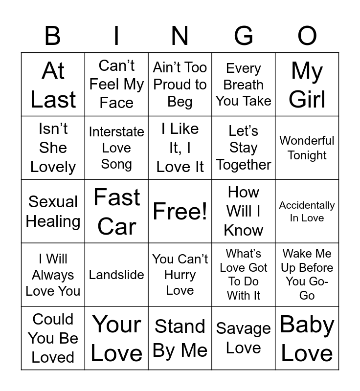 This bingo card has a free space and 66 words: Sucker, Hooked on a Feeling, I Want You Back, Wake Me Up Before You Go-Go, You’ve Got a Friend in Me, I’m Gonna Be (500 Miles), Can’t Feel My Face, I’m a Believer, I Like It, I Love It, Kiss, You Can’t Hurry Love, Wouldn’t It Be Nice, Accidentally In Love, My Girl, You Are The Best Thing, Isn’t She Lovely, Fast Car, At Last, Your Body is a Wonderland, Let’s Stay Together, Landslide, I Will Always Love You, Every Breath You Take, Can’t Take My Eyes Off of You, (Your Love Keeps Lifting Me) Higher, You Make Me Feel Like Dancing, Signed, Sealed, Delivered, I Can’t Help Myself (Sugar Pie, Honey Bunch), Baby Love, Brown Eyed Girl, Could You Be Loved, Ain’t No Mountain High Enough, I Got You (I Feel Good), Call Me Maybe, What’s Love Got To Do With It, Your Love, I’m In Love With a Monster, Sexual Healing, Savage Love, Wild Thing, Interstate Love Song, You Give Love a Bad Name, How Will I Know, You Make My Dreams (Come True), What Is Love, Love Train, Wonderful Tonight, You Sexy Thing, I Got You Babe, How Sweet It Is, Do You Love Me, This Will Be (An Everlasting Love), Best of My Love, For Once in My Life, Love Will Keep Us Together, Crazy Love, Sugar Sugar, Love Shack, Ain’t Too Proud to Beg, Stand By Me, I’ll Stand By You, I Just Called to Say I Love You, Isn’t She Lovely, You Belong With Me, Islands in the Stream and Is This Love.