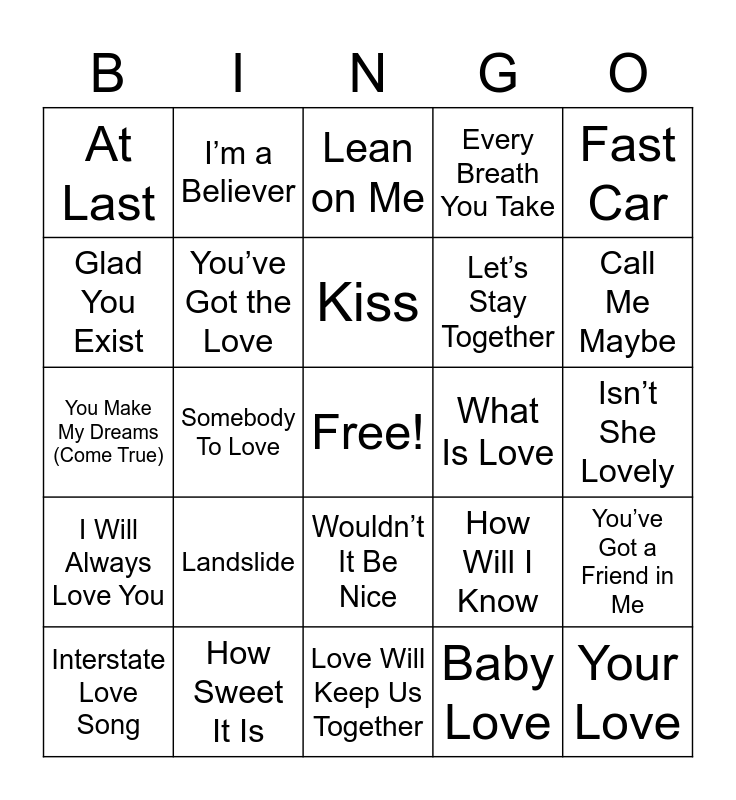 This bingo card has a free space and 67 words: Sucker, What Makes You Beautiful, Wake Me Up Before You Go-Go, You’ve Got a Friend in Me, I’m Gonna Be (500 Miles), Can’t Feel My Face, I’m a Believer, I Like It, I Love It, Kiss, You Can’t Hurry Love, Wouldn’t It Be Nice, You Are The Best Thing, Isn’t She Lovely, Fast Car, Let’s Get It On, Glad You Exist, Somebody To Love, At Last, Your Body is a Wonderland, Let’s Stay Together, Landslide, I Will Always Love You, Every Breath You Take, Baby Love, Brown Eyed Girl, Could You Be Loved, Ain’t No Mountain High Enough, I Got You (I Feel Good), Call Me Maybe, What’s Love Got To Do With It, Your Love, I’m In Love With a Monster, Sexual Healing, Savage Love, Wild Thing, Interstate Love Song, You Give Love a Bad Name, How Will I Know, You Make My Dreams (Come True), Got My Mind Set on You, You’re the One That I Want, You’ve Got the Love, What Is Love, Love Train, Wonderful Tonight, You Sexy Thing, I Got You Babe, How Sweet It Is, Do You Love Me, Chapel of Love, Lean on Me, Crazy Little Thing Called Love, This Will Be (An Everlasting Love), Best of My Love, For Once in My Life, Love Will Keep Us Together, Crazy Love, Sugar Sugar, Love Shack, Ain’t Too Proud to Beg, Stand By Me, I’ll Stand By You, I Just Called to Say I Love You, Isn’t She Lovely, You Belong With Me, Islands in the Stream and Is This Love.