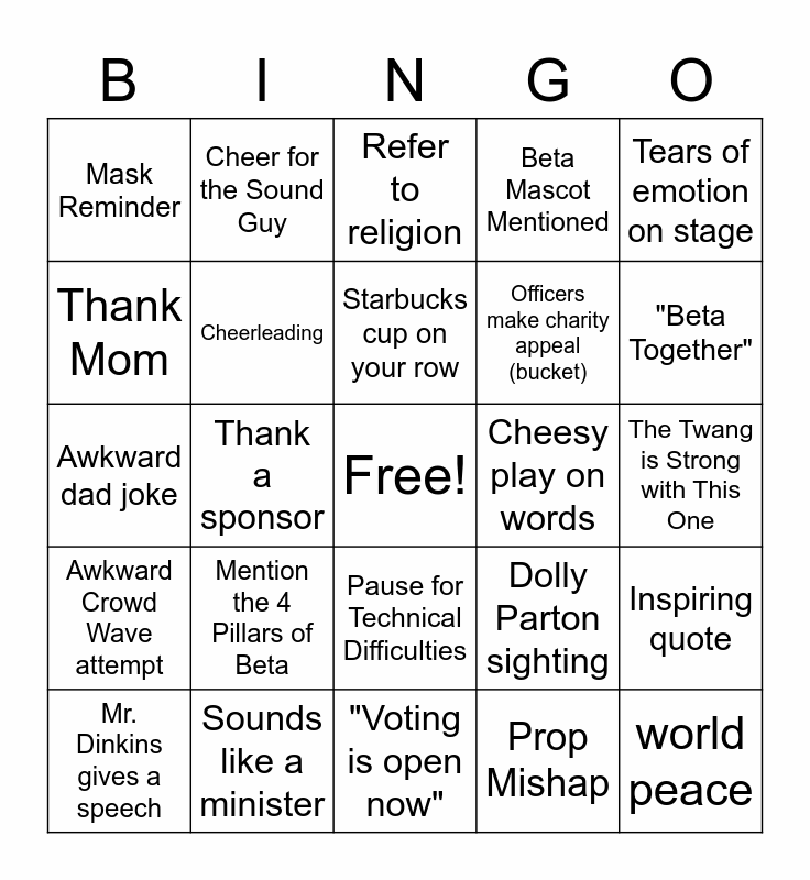 This bingo card has a free space and 29 words: Mr. Dinkins gives a speech, Nashville for National Convention, Thank a sponsor, Dancing Before a session, Mask Reminder, Refer to religion, Cheerleading, Mention the 4 Pillars of Beta, Cheesy play on words, Sounds like a minister, The Twang is Strong with This One, world peace, "Voting is open now", Prop Mishap, "Beta Together", "Let us lead by serving others", Pause for Technical Difficulties, Awkward Crowd Wave attempt, Tears of emotion on stage, Awkward dad joke, Dolly Parton sighting, Music through the Decades in one performance, Officers make charity appeal (bucket), Thank Mom, Beta Mascot Mentioned, Cheer for the Sound Guy, Inspiring quote, Starbucks cup on your row and Disney Inspired Skit.