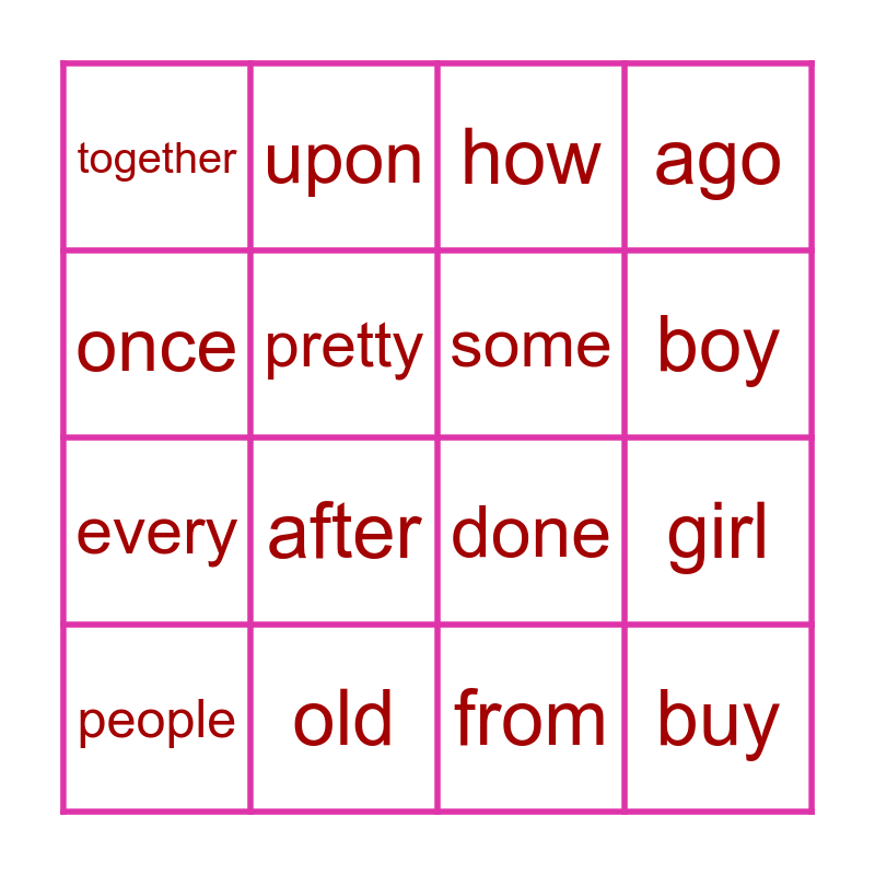 This bingo card has 30 words: away, water, girl, now, together, how, some, any, old, way, from, people, why, happy, after, today, so, buy, green, once, done, grow, upon, every, pretty, ago, soon, should, boy and work.