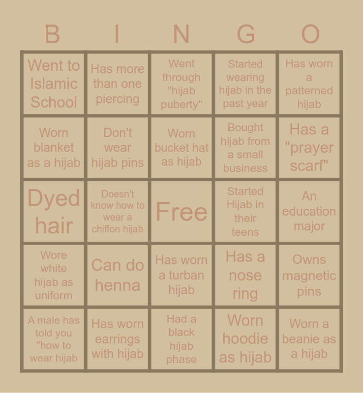 This bingo card has a free space and 24 words: Can do henna, Has worn earrings with hijab, Worn bucket hat as hijab, A male has told you "how to wear hijab, Has worn a patterned hijab, Went to Islamic School, Worn blanket as a hijab, Has more than one piercing, Started Hijab in their teens, Has worn a turban hijab, Bought hijab from a small business, Dyed hair, Has a nose ring, Owns magnetic pins, Don't wear hijab pins, Worn hoodie as hijab, An education major, Went through "hijab puberty", Has a "prayer scarf", Doesn't know how to wear a chiffon hijab, Worn a beanie as a hijab, Wore white hijab as uniform, Started wearing hijab in the past year and Had a black hijab phase.