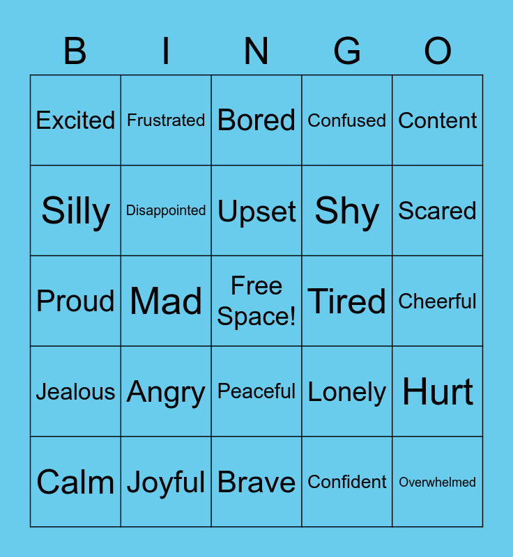 This bingo card has a free space and 29 words: Calm, Sad, Mad, Happy, Excited, Bored, Disappointed, Angry, Tired, Joyful, Cheerful, Overwhelmed, Brave, Confident, Scared, Worried, Peaceful, Jealous, Content, Proud, Lonely, Stressed, Shy, Silly, Confused, Frustrated, Hurt, Upset and Relaxed.