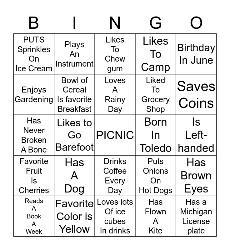 This bingo card has a free space and 24 words: Has A Dog, Favorite Color is Yellow, Loves A Rainy Day, Reads A Book A Week, Birthday In June, PUTS Sprinkles On Ice Cream, Enjoys Gardening, Plays An Instrument, Born In Toledo, Drinks Coffee Every Day, Liked To Grocery Shop, Has Never Broken A Bone, Puts Onions On Hot Dogs, Has Brown Eyes, Bowl of Cereal Is favorite Breakfast, Has Flown A Kite, Is Left-handed, Likes To Chew gum, Saves Coins, Likes to Go Barefoot, Has a Michigan License plate, Favorite Fruit Is Cherries, Likes To Camp and Loves lots Of ice cubes In drinks.