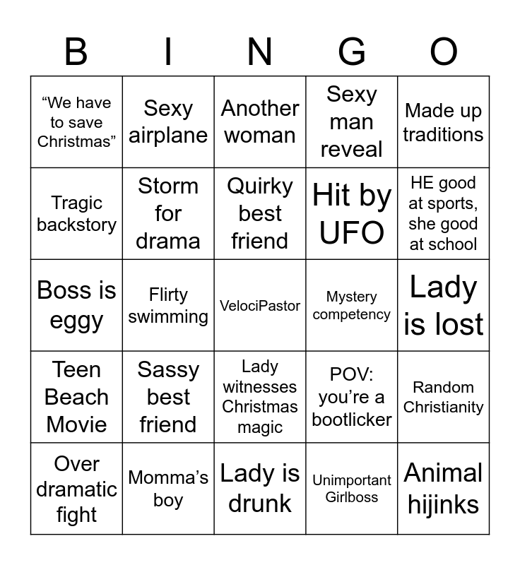 This bingo card has a free space and 24 words: Sassy best friend, Momma’s boy, Quirky best friend, Over dramatic fight, Made up traditions, “We have to save Christmas”, Tragic backstory, Sexy airplane, Mystery competency, Lady witnesses Christmas magic, Hit by UFO, Boss is eggy, POV: you’re a bootlicker, Random Christianity, Storm for drama, Unimportant Girlboss, Lady is lost, Another woman, HE good at sports, she good at school, Flirty swimming, Animal hijinks, Teen Beach Movie, Sexy man reveal and Lady is drunk.