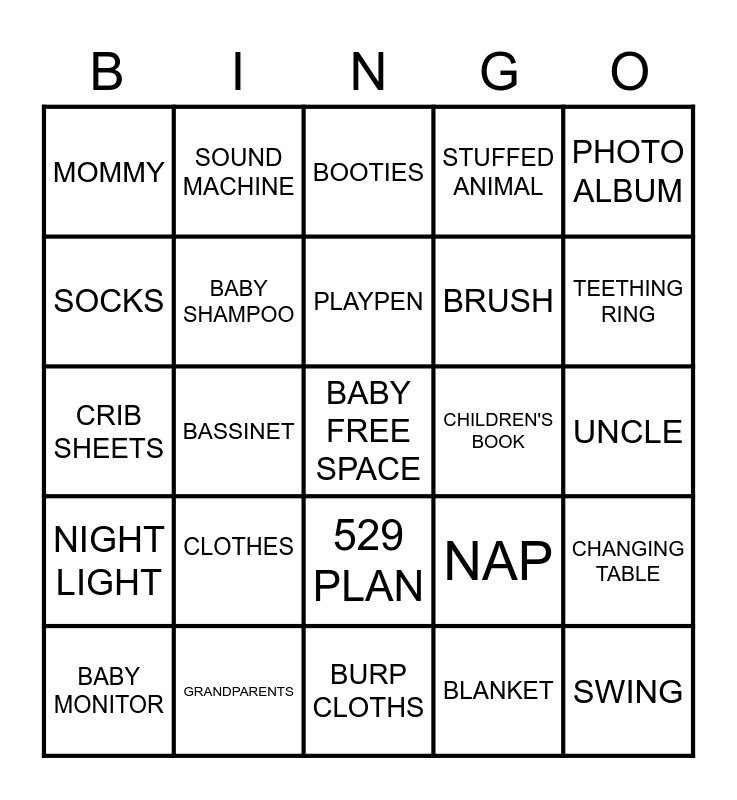 This bingo card has a free space and 44 words: MOBILE, SWING, BIBS, BABY MONITOR, DIAPER CREAM, BLANKET, BOOTIES, HIGH CHAIR, PHOTO ALBUM, GRANDPARENTS, STUFFED ANIMAL, CHILDREN'S BOOK, 529 PLAN, CLOTHES, SAVINGS BOND, BURP CLOTHS, ONESIES, CRIB SHEETS, STROLLER, TEETHING RING, SOUND MACHINE, DADDY, DIAPERS, MOMMY, AUNTIE, UNCLE, WIPES, MITTENS, NAP, NIGHT LIGHT, SYRING, CHANGING TABLE, RATTLE, SWADDLE, BASSINET, NURSEY, THERMOMETER, BABY FOOD, PLAYPEN, SOCKS, BRUSH, COMB, BABY SHAMPOO and DIAPER BAG.