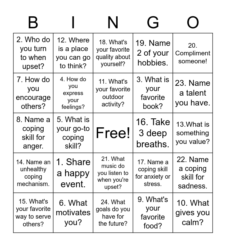 This bingo card has a free space and 24 words: 1. Share a happy event., 6. What motivates you?, 11. What's your favorite outdoor activity?, 15. What's your favorite way to serve others?, 20. Compliment someone!, 2. Who do you turn to when upset?, 7. How do you encourage others?, 12. Where is a place you can go to think?, 16. Take 3 deep breaths., 21. What music do you listen to when you're upset?, 3. What is your favorite book?, 8. Name a coping skill for anger., 17. Name a coping skill for anxiety or stress., 22. Name a coping skill for sadness., 4. How do you express your feelings?, 9. What's your favorite food?, 13.What is something you value?, 18. What's your favorite quality about yourself?, 23. Name a talent you have., 5. What is your go-to coping skill?, 10. What gives you calm?, 14. Name an unhealthy coping mechanism., 19. Name 2 of your hobbies. and 24. What goals do you have for the future?.