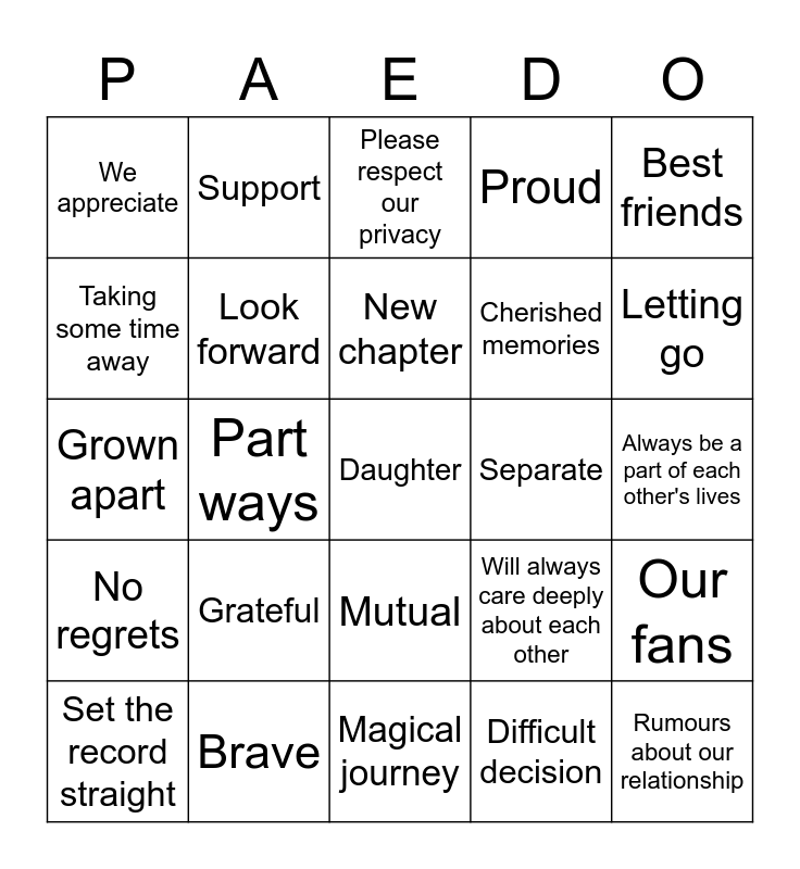 This bingo card has a free space and 24 words: Grateful, Brave, New chapter, Set the record straight, Best friends, We appreciate, Taking some time away, Support, Separate, Mutual, Cherished memories, Grown apart, Will always care deeply about each other, Our fans, Look forward, Difficult decision, Always be a part of each other's lives, Please respect our privacy, Letting go, Part ways, Rumours about our relationship, No regrets, Proud and Magical journey.