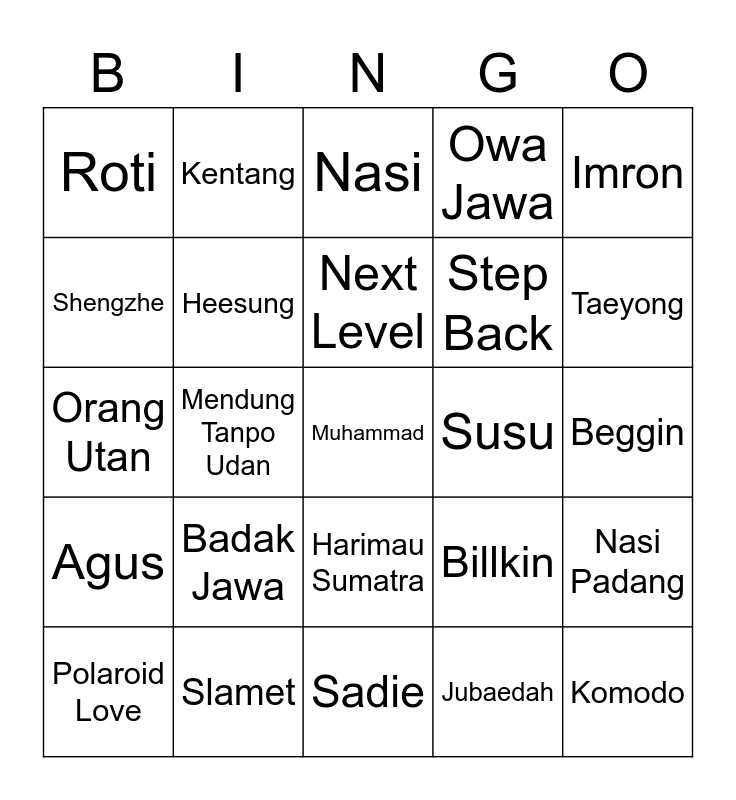 This bingo card has 25 words: Agus, Slamet, Muhammad, Jubaedah, Imron, Roti, Kentang, Nasi, Susu, Nasi Padang, Shengzhe, Heesung, Sadie, Billkin, Taeyong, Polaroid Love, Mendung Tanpo Udan, Next Level, Step Back, Beggin, Orang Utan, Badak Jawa, Harimau Sumatra, Owa Jawa and Komodo.