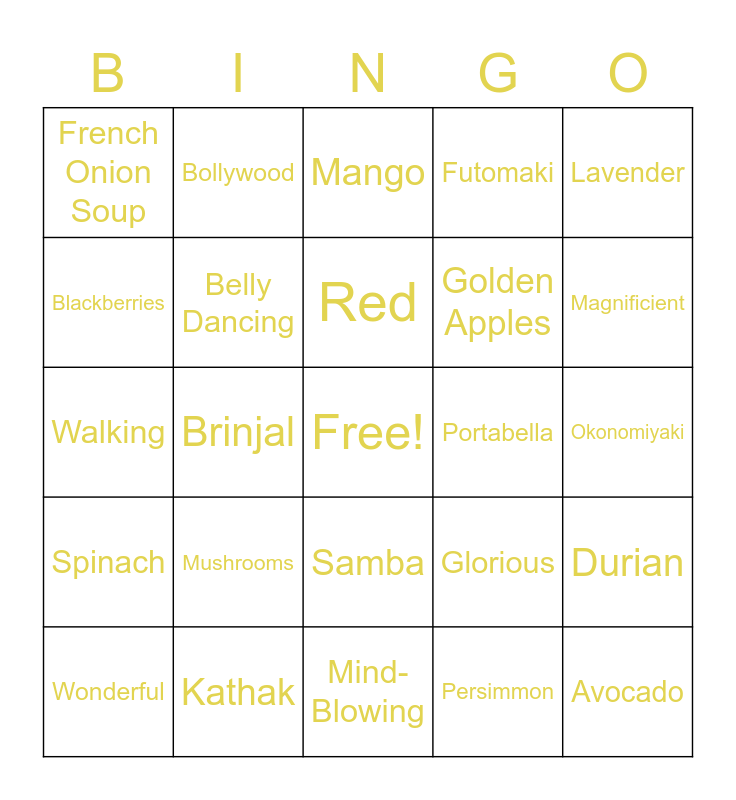 This bingo card has a free space and 40 words: Meditation, Walking, Traveling, Belly Dancing, Kathak, Samba, Red, Golden, Lavender, Spinach, Brinjal, Futomaki, Avocado, Okonomiyaki, Portabella, Mushrooms, Dhal Tarka, French Onion Soup, Greek Yoghurt, Mango, Durian, Persimmon, Golden Apples, Blackberries, Blueberries, Bread Pudding, Panna Cotta, Banana Choco Bread, Sitar, Flute, Piano, Wonderful, Happy, Glorious, Magnificient, Mind-Blowing, Amazing, Classical Opera, Bollywood and Mash-Ups.
