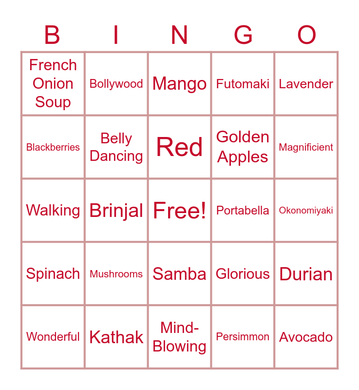 This bingo card has a free space and 40 words: Meditation, Walking, Traveling, Belly Dancing, Kathak, Samba, Red, Golden, Lavender, Spinach, Brinjal, Futomaki, Avocado, Okonomiyaki, Portabella, Mushrooms, Dhal Tarka, French Onion Soup, Greek Yoghurt, Mango, Durian, Persimmon, Golden Apples, Blackberries, Blueberries, Bread Pudding, Panna Cotta, Banana Choco Bread, Sitar, Flute, Piano, Wonderful, Happy, Glorious, Magnificient, Mind-Blowing, Amazing, Classical Opera, Bollywood and Mash-Ups.