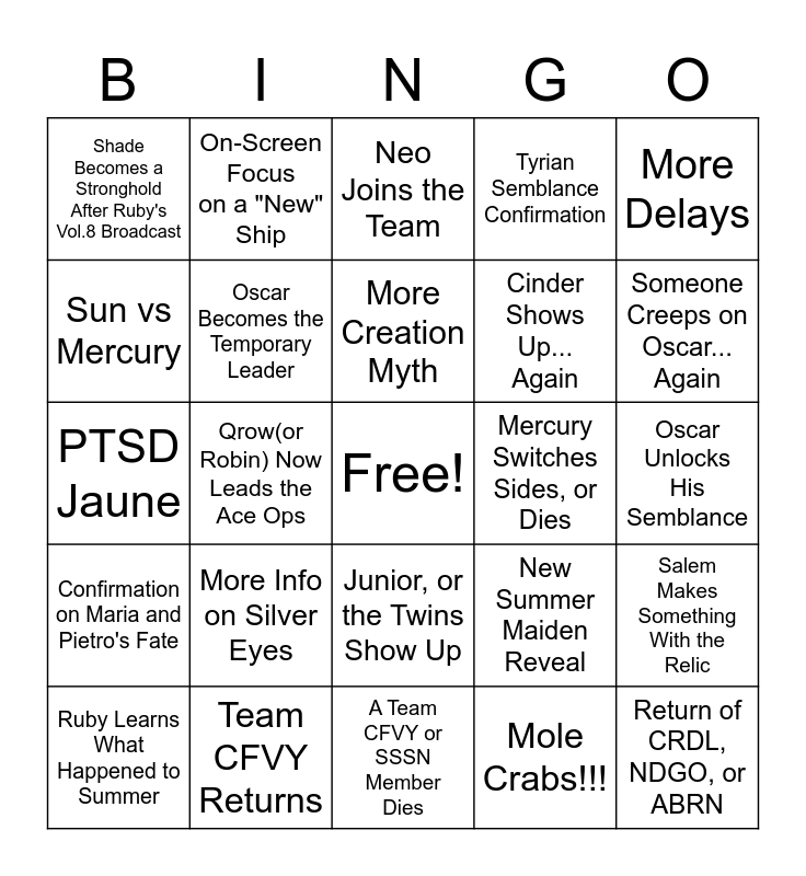 This bingo card has a free space and 24 words: More Info on Silver Eyes, Team CFVY Returns, More Creation Myth, Ruby Learns What Happened to Summer, More Delays, Shade Becomes a Stronghold After Ruby's Vol.8 Broadcast, Sun vs Mercury, On-Screen Focus on a "New" Ship, Mercury Switches Sides, or Dies, Junior, or the Twins Show Up, Cinder Shows Up... Again, PTSD Jaune, New Summer Maiden Reveal, Salem Makes Something With the Relic, Oscar Becomes the Temporary Leader, Mole Crabs!!!, Oscar Unlocks His Semblance, Neo Joins the Team, Someone Creeps on Oscar... Again, Qrow(or Robin) Now Leads the Ace Ops, Return of CRDL, NDGO, or ABRN, Confirmation on Maria and Pietro's Fate, Tyrian Semblance Confirmation and A Team CFVY or SSSN Member Dies.