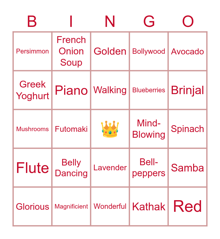 This bingo card has a free space and 42 words: Meditation, Walking, Traveling, Belly Dancing, Kathak, Samba, Red, Peach, Golden, Lavender, Spinach, Brinjal, Futomaki, Avocado, Okonomiyaki, Bell-peppers, Portabella, Mushrooms, Dhal Tarka, French Onion Soup, Greek Yoghurt, Mango, Durian, Persimmon, Golden Apples, Blackberries, Blueberries, Bread Pudding, Panna Cotta, Banana Choco Bread, Sitar, Flute, Piano, Wonderful, Happy, Glorious, Magnificient, Mind-Blowing, Amazing, Classical Opera, Bollywood and Mash-Ups.