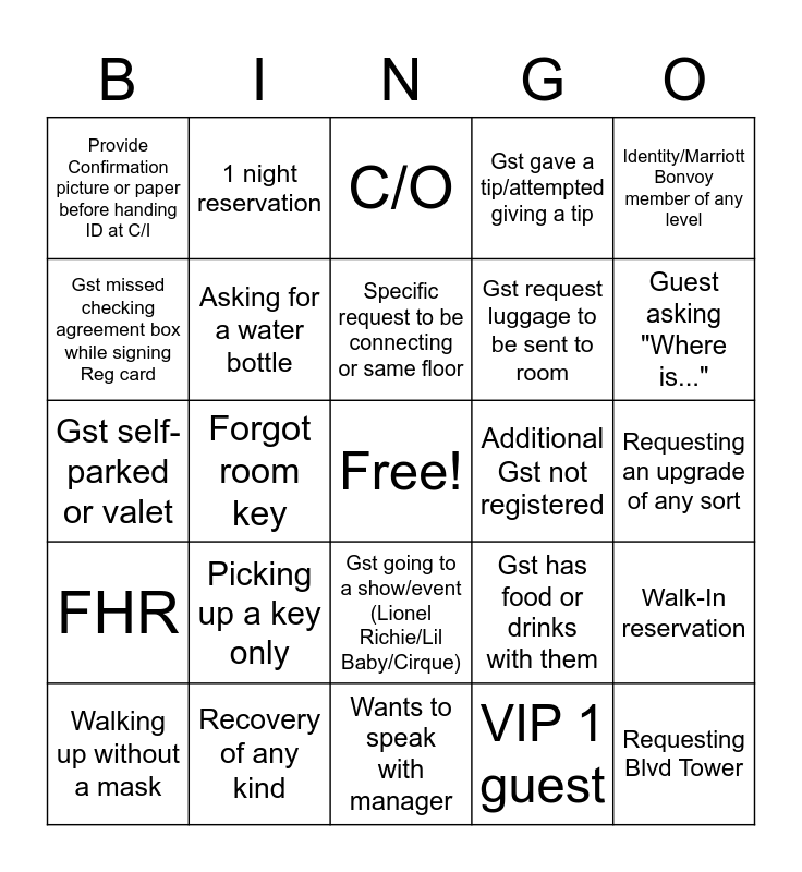 This bingo card has a free space and 29 words: Walking up without a mask, CC declined, Forgot room key, Came to C/I and hunting for ID in bag/wallet, Provide Confirmation picture or paper before handing ID at C/I, C/O, Asking for a water bottle, Picking up a key only, Additional Gst not registered, Recovery of any kind, Requesting an upgrade of any sort, Requesting Blvd Tower, Wants to speak with manager, VIP 1 guest, Guest asking "Where is...", Gst going to a sports event during stay (Pro Bowl), Gst going to a show/event (Lionel Richie/Lil Baby/Cirque), FHR, Identity/Marriott Bonvoy member of any level, Gst self-parked or valet, Gst has food or drinks with them, Gst walking up to desk prior to agent walking to them, Gst request luggage to be sent to room, Gst missed checking agreement box while signing Reg card, Gst gave a tip/attempted giving a tip, 1 night reservation, Walk-In reservation, Specific request to be connecting or same floor and Gst asking recommendations of restaurants.