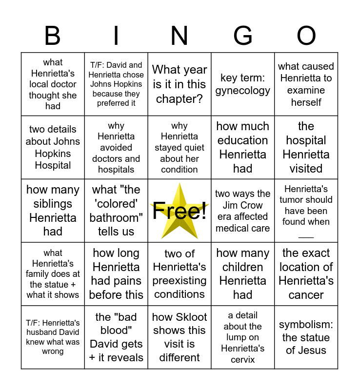 This bingo card has a free space and 24 words: how long Henrietta had pains before this, the "bad blood" David gets + it reveals, why Henrietta stayed quiet about her condition, T/F: Henrietta's husband David knew what was wrong, what caused Henrietta to examine herself, what Henrietta's local doctor thought she had, two details about Johns Hopkins Hospital, T/F: David and Henrietta chose Johns Hopkins because they preferred it, two ways the Jim Crow era affected medical care, two of Henrietta's preexisting conditions, how much education Henrietta had, how many siblings Henrietta had, how many children Henrietta had, the exact location of Henrietta's cancer, why Henrietta avoided doctors and hospitals, a detail about the lump on Henrietta's cervix, Henrietta's tumor should have been found when ___, What year is it in this chapter?, the hospital Henrietta visited, what "the 'colored' bathroom" tells us, symbolism: the statue of Jesus, what Henrietta's family does at the statue + what it shows, key term: gynecology and how Skloot shows this visit is different.