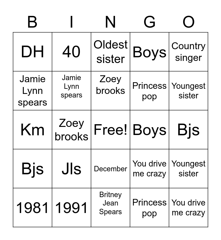 This bingo card has a free space and 34 words: Britney Jean Spears, Princess pop, April, 4, Bjs, Jamie Lynn spears, Country singer, 1981, 40, Jls, Zoey brooks, Oldest sister, 30, Bjs, Boys, Youngest sister, 1991, Km, Jls, You drive me crazy, December, 2, DH, Bjs, Britney Jean Spears, You drive me crazy, Boys, Oldest sister, Princess pop, Jamie Lynn spears, Follow me, Zoey brooks, Youngest sister and Country singer.