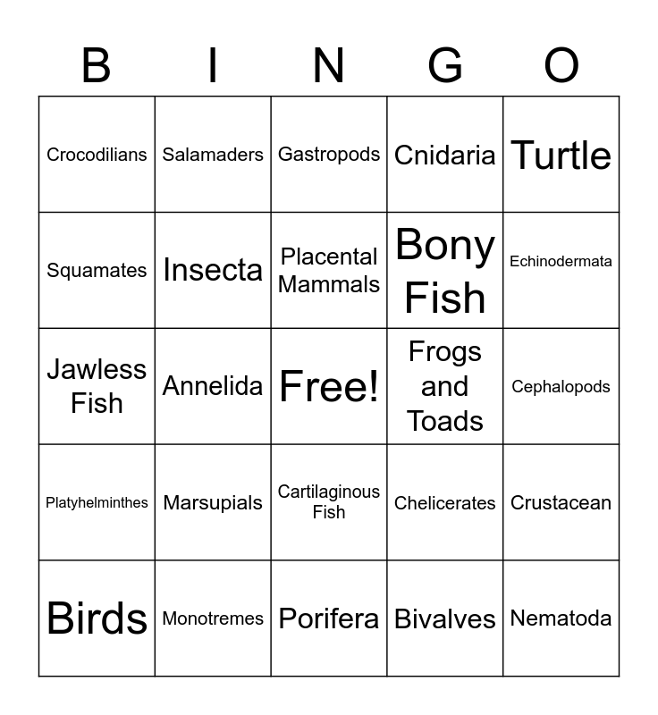 This bingo card has a free space and 24 words: Marsupials, Monotremes, Placental Mammals, Birds, Turtle, Crocodilians, Squamates, Salamaders, Frogs and Toads, Cartilaginous Fish, Bony Fish, Jawless Fish, Chelicerates, Crustacean, Insecta, Bivalves, Cephalopods, Gastropods, Echinodermata, Annelida, Nematoda, Platyhelminthes, Cnidaria and Porifera.