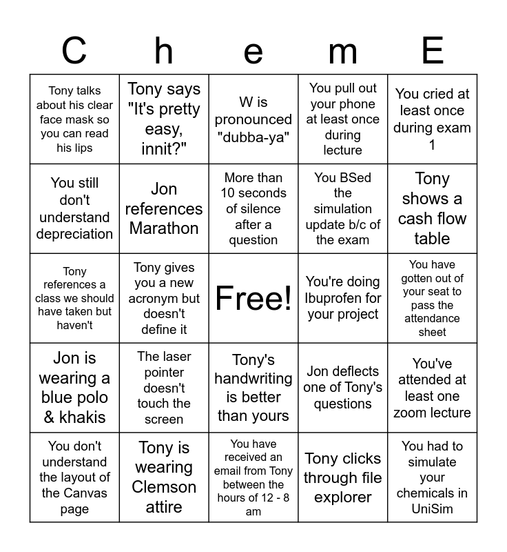 This bingo card has a free space and 24 words: The laser pointer doesn't touch the screen, Tony is wearing Clemson attire, More than 10 seconds of silence after a question, You don't understand the layout of the Canvas page, You cried at least once during exam 1, Tony talks about his clear face mask so you can read his lips, You still don't understand depreciation, Tony says "It's pretty easy, innit?", You're doing Ibuprofen for your project, Tony's handwriting is better than yours, You BSed the simulation update b/c of the exam, Tony references a class we should have taken but haven't, Jon deflects one of Tony's questions, You've attended at least one zoom lecture, Jon references Marathon, Tony clicks through file explorer, You have gotten out of your seat to pass the attendance sheet, W is pronounced "dubba-ya", Tony shows a cash flow table, Tony gives you a new acronym but doesn't define it, You had to simulate your chemicals in UniSim, Jon is wearing a blue polo & khakis, You pull out your phone at least once during lecture and You have received an email from Tony between the hours of 12 - 8 am.